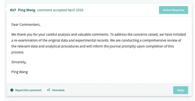 而对于在 PubPeer 出现的质疑,通讯作者 Ping Wang的最新回应是:“针对所提出的问题,我们已经启动了对原始数据和实验记录的重新核查。我们正在对相关数据及分析流程进行全面审查,并将在这一过程完成后及时告知期刊。”